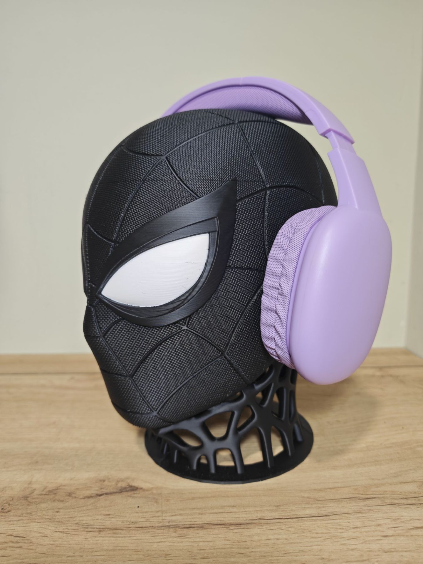 Dale a tu setup un aspecto imponente y minimalista con el soporte de auriculares de Spiderman en su versión Black Suit. Esta pieza, fabricada mediante impresión 3D de alta precisión, es la combinación perfecta entre un accesorio organizador y una escultura de diseño para tu escritorio.