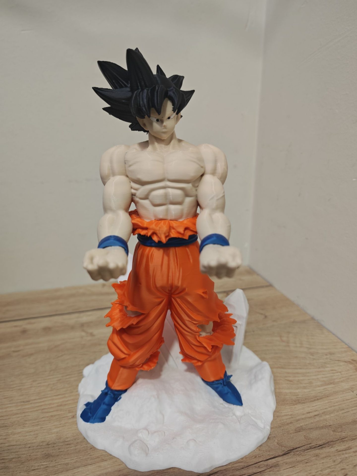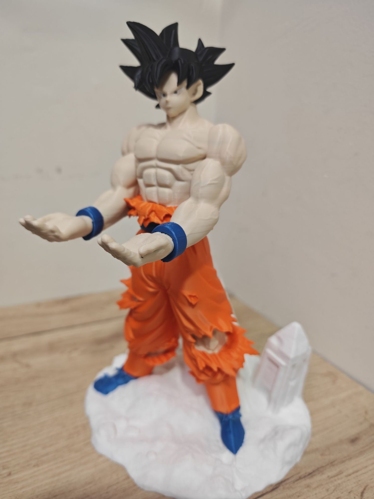 Diseño Épico: Representa a Goku con su emblemático pantalón naranja desgarrado y una musculatura definida, sobre una base que simula un terreno de combate con cristales de energía.